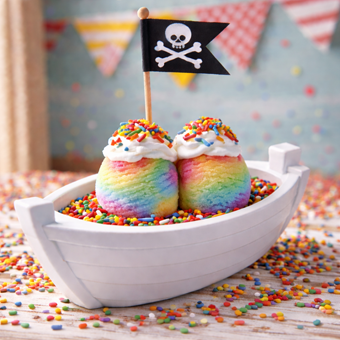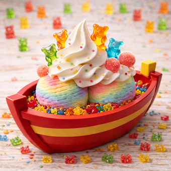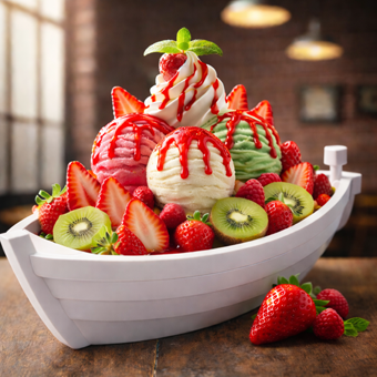 | Je eine Kugel Vanille-, Erdbeer- und Regenbogen-Eis (Mango, Pfirsich, Erdbeere), Kiwis, Erdbeeren, Sahne und Sauce |