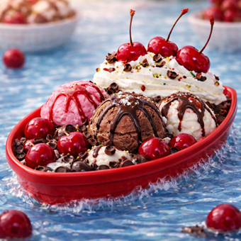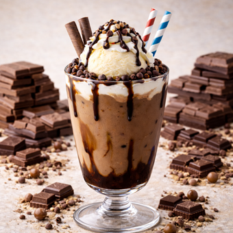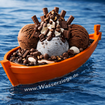 | Je eine Kugel Schoko-, Stracciatella-, Karamell-Eis, Sahne, Schokoladensauce, Schokoladenraspeln und Schokodeko |