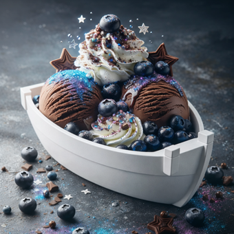 | Je eine Kugel Schoko-, Waldbeere- und Stracciatella-Eis, Sahne, Heidelbeersauce und Heidelbeeren |