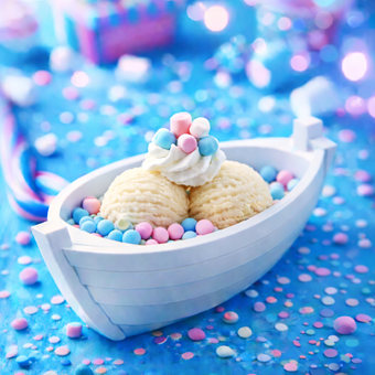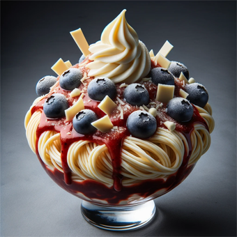 | Vanille-Spagetti-Eis mit Sahne, frische Heidelbeeren mit Sauce, weiße Schokostreuseln |