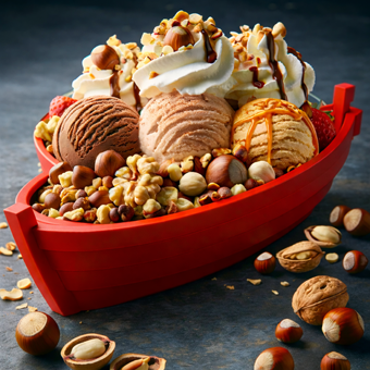 | Je eine Kugel Malaga-, Haselnuss- und Karamell-Eis, mit Sahne, Nüssen und Nuss-Sauce |