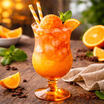 | Eine Kugel Orangen-Eis mit Aperol, Sekt und Orange |