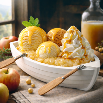| Je eine Kugel Vanille-, Malaga- und Karamell-Eis, Apfelmus, Sahne und Eierlikör |